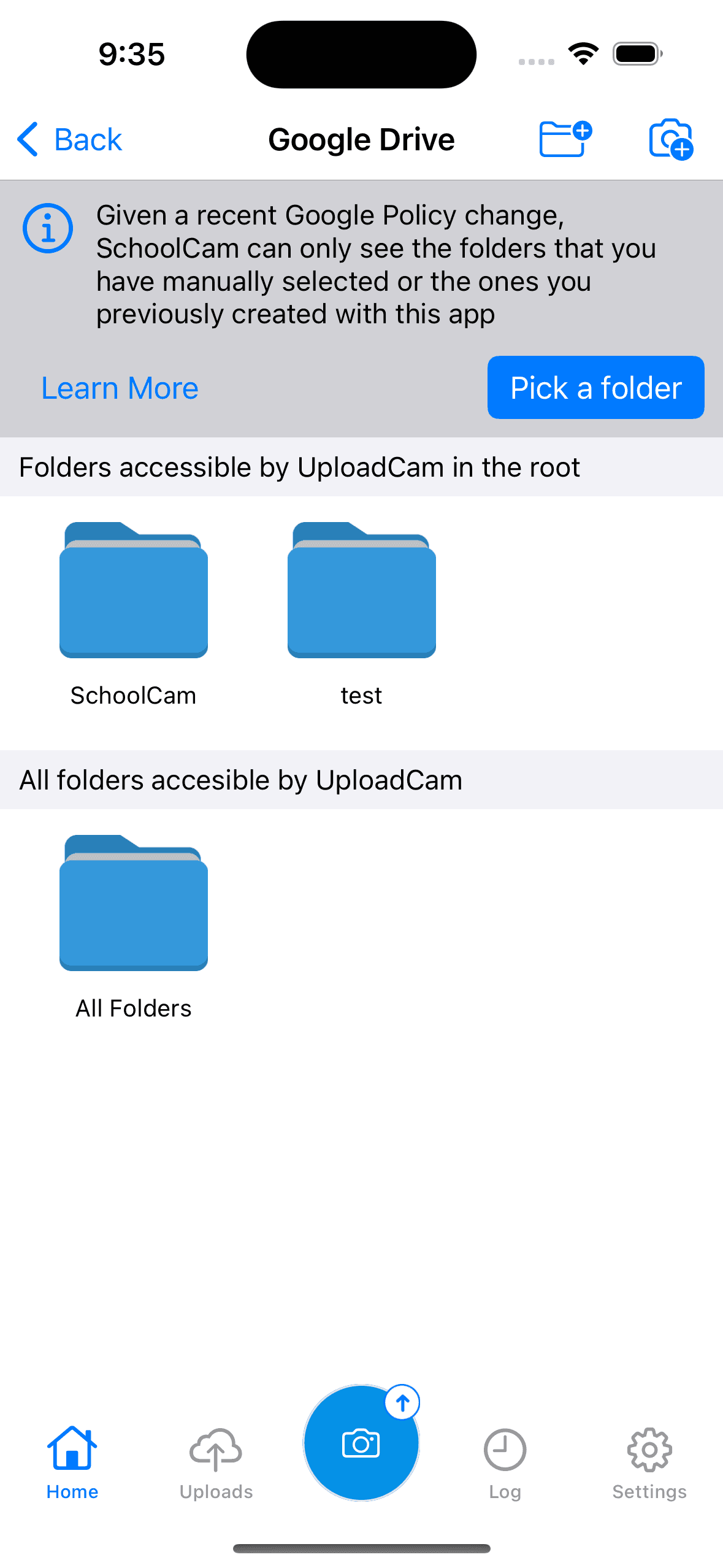 When you need to upload or access files from Google Drive, you will now be prompted to manually select the specific folders you wish the app to access. This means an extra step in the user flow when choosing a folder, but it will significantly enhance the security of your data. This is how the new screen to select a destination folder looks like: